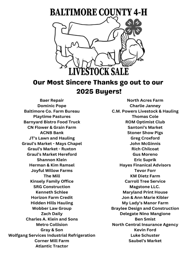Bid first, bid often and bid last! Once the hammer falls, and you are deemed the winning bidder, you’ll get your photo taken immediately with the 4-Her and your purchased prize animal. After the sale closes, you’ll check out by paying your bill with cash, check or credit card. The animals will be shipped for processing to your desired, or a recommended, butcher. You will need to call the butcher on Monday morning to discuss which cuts you would like. All butchers have a basic sheet that you will be able to view which shows how many lamb chops you can get, how large your rump roasts will be, or how many pounds of bacon you’d like in a pack. The butcher will notify you of pickup dates and the last step is to cook the locally grown meat and enjoy the end product with your family and friends! Of course, return next year and repeat. If you have any questions regarding the auction, livestocksale@baltimorecounty4hfair.com